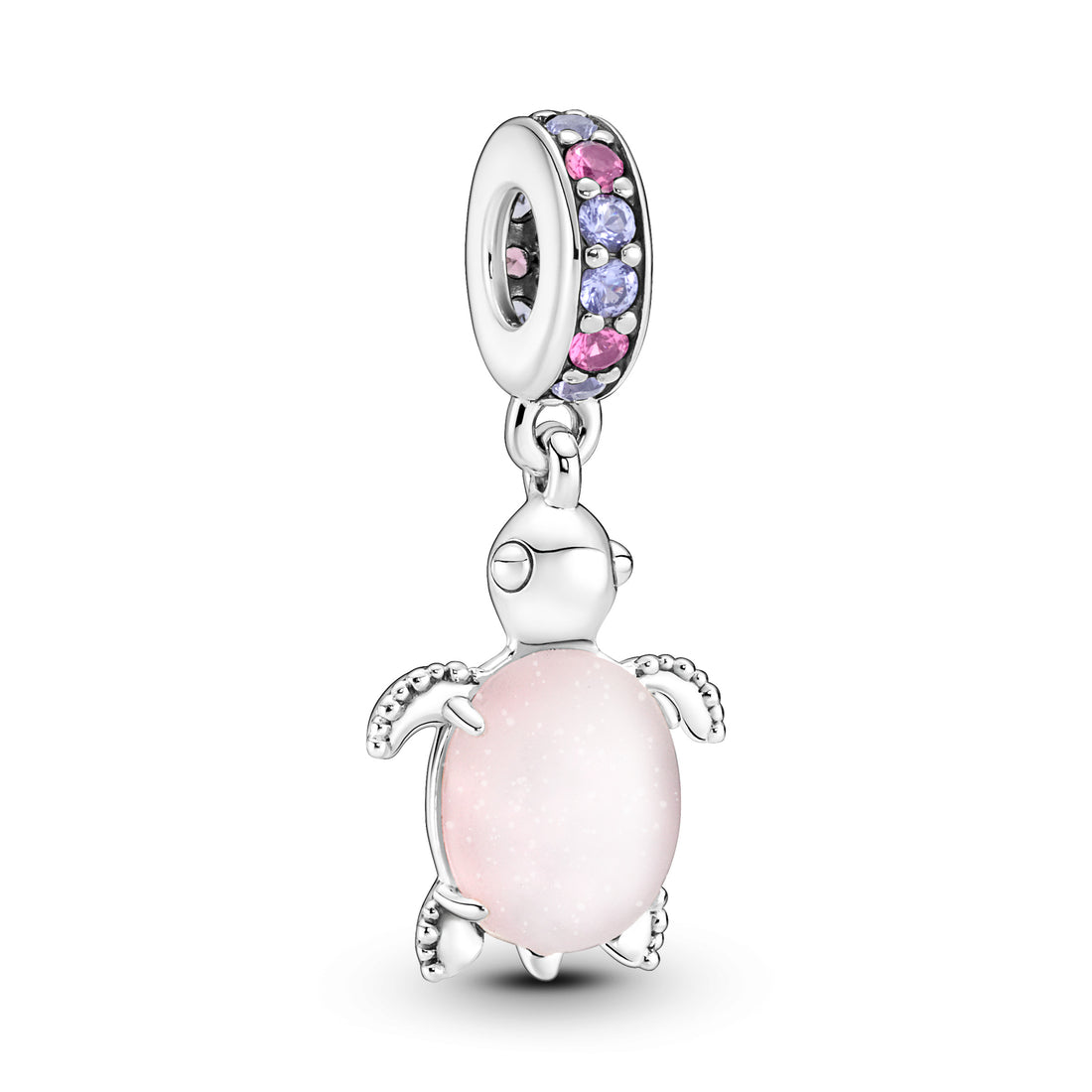 Sea Turtle Sterling Silver Dangle With Frosted Dichroic Pink Murano Glass, Regal Purple And Phlox Pink Crystal