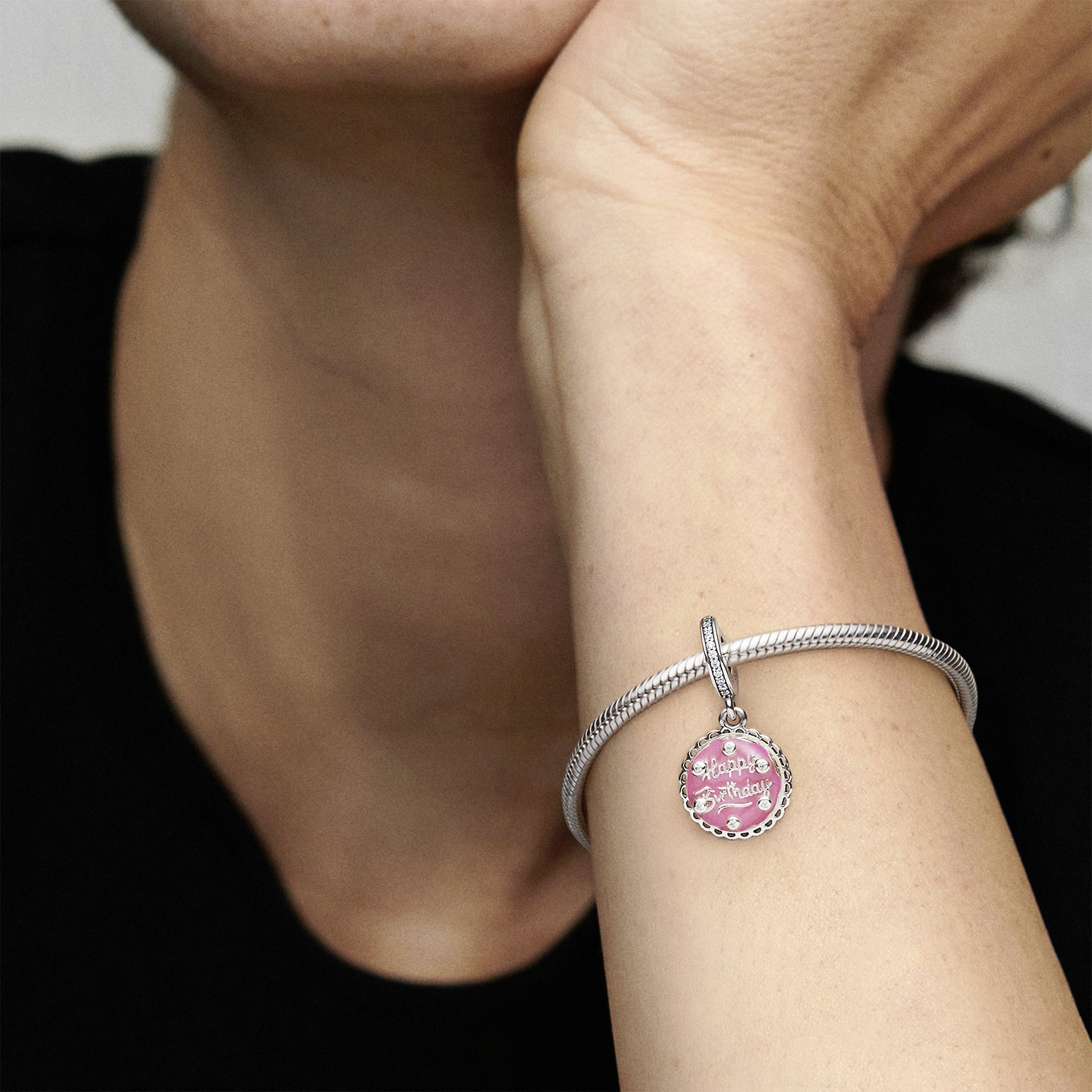 Birthday Cake Sterling Silver Dangle With Clear Cubic Zirconia And Pink Enamel