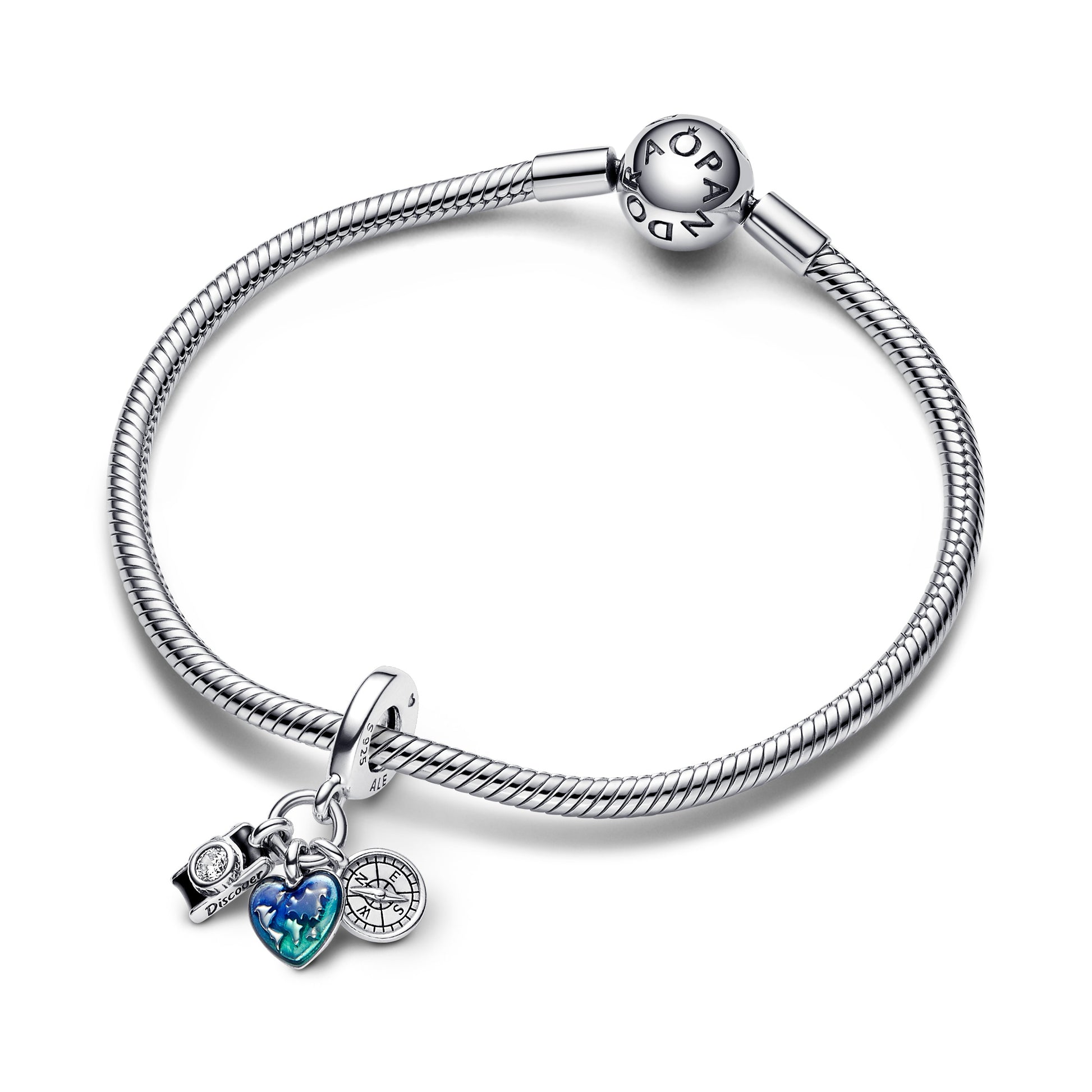 Camera, Heart And Compass Sterling Silver Triple Dangle With Clear Cubic Zirconia, Black, Transparent Blue And Green Enamel