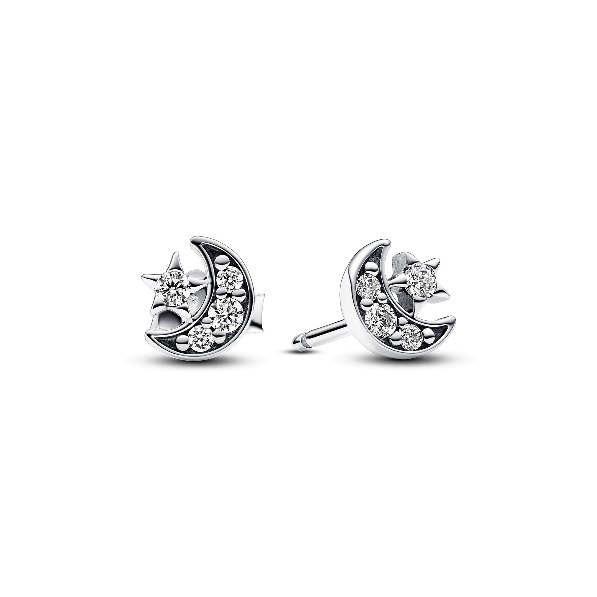 Crescent Moon Sterling Silver Stud Earrings With Clear Cubic Zirconia