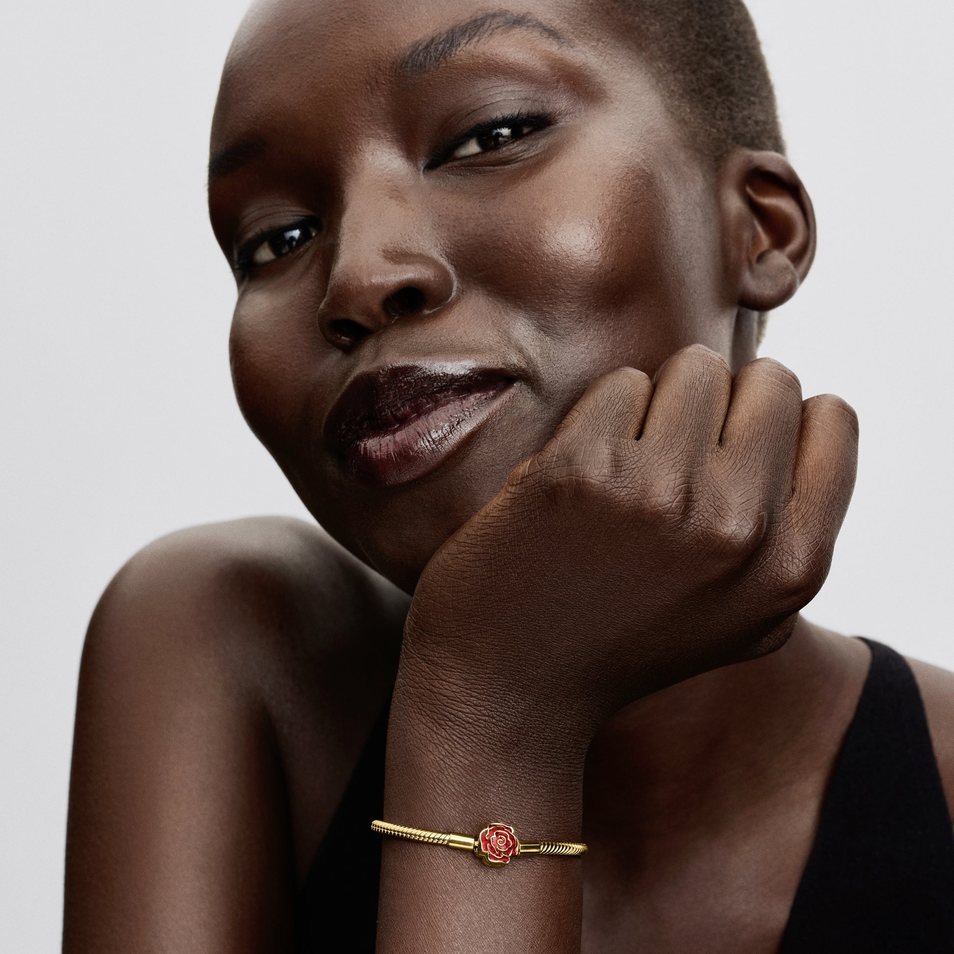 Disney Beauty & The Beast Snake Chain 14K Gold-Plated Bracelet With Rose Clasp And Holo Glittery Red Enamel