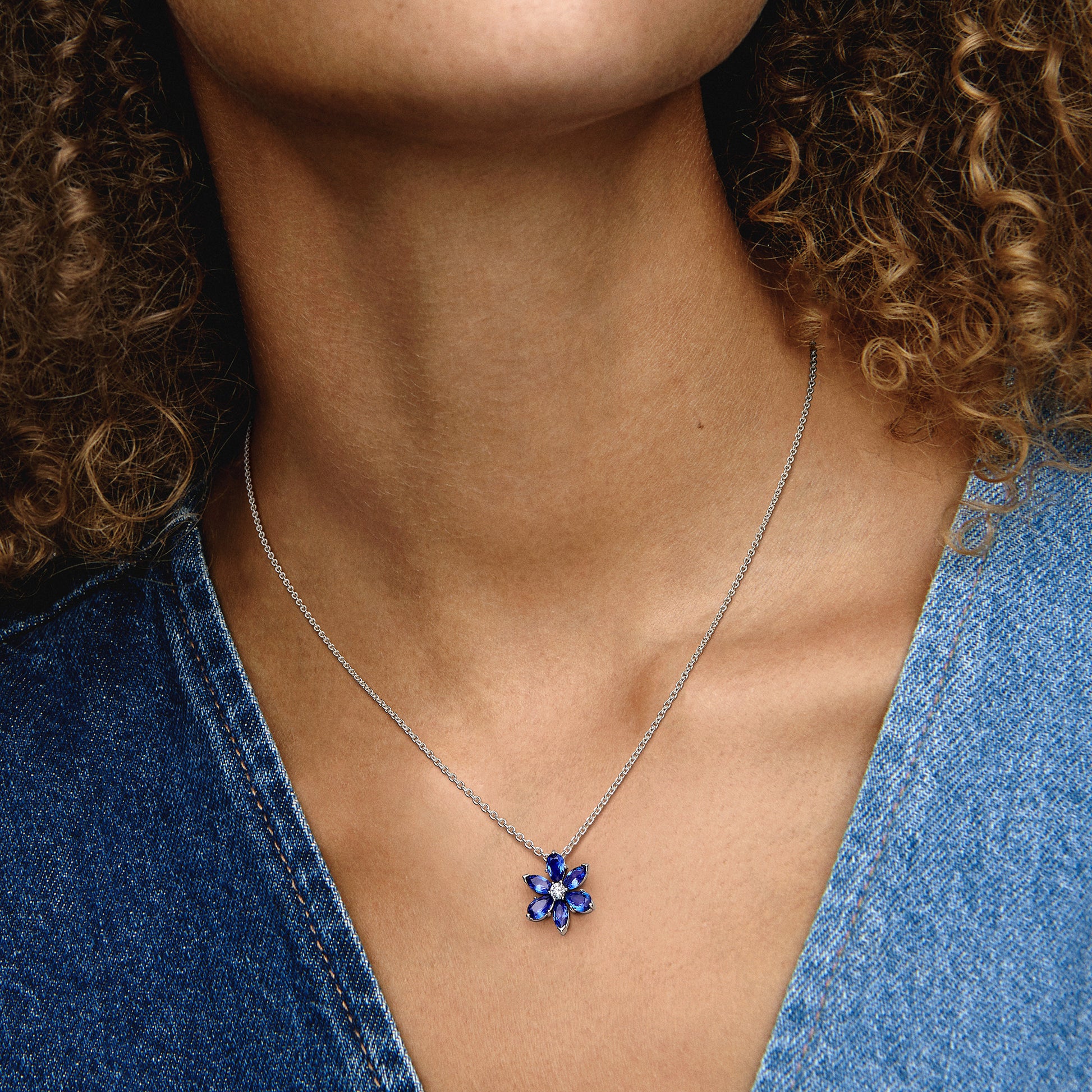 Herbarium Cluster Sterling Silver Collier With Princess Blue Crystal And Clear Cubic Zirconia