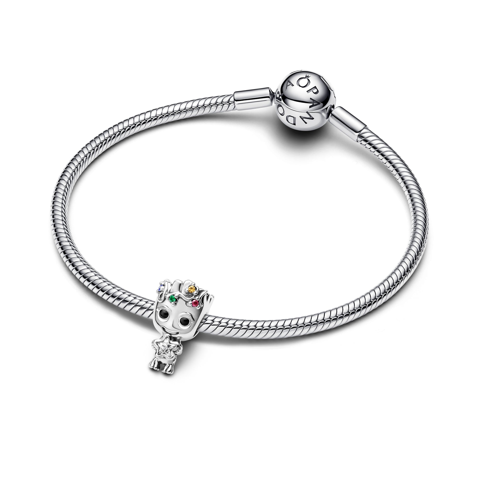 Marvel Groot Sterling Silver Charm With Clear And Red Cubic Zirconia, Blue, Green And Yellow Crystal And Black Enamel