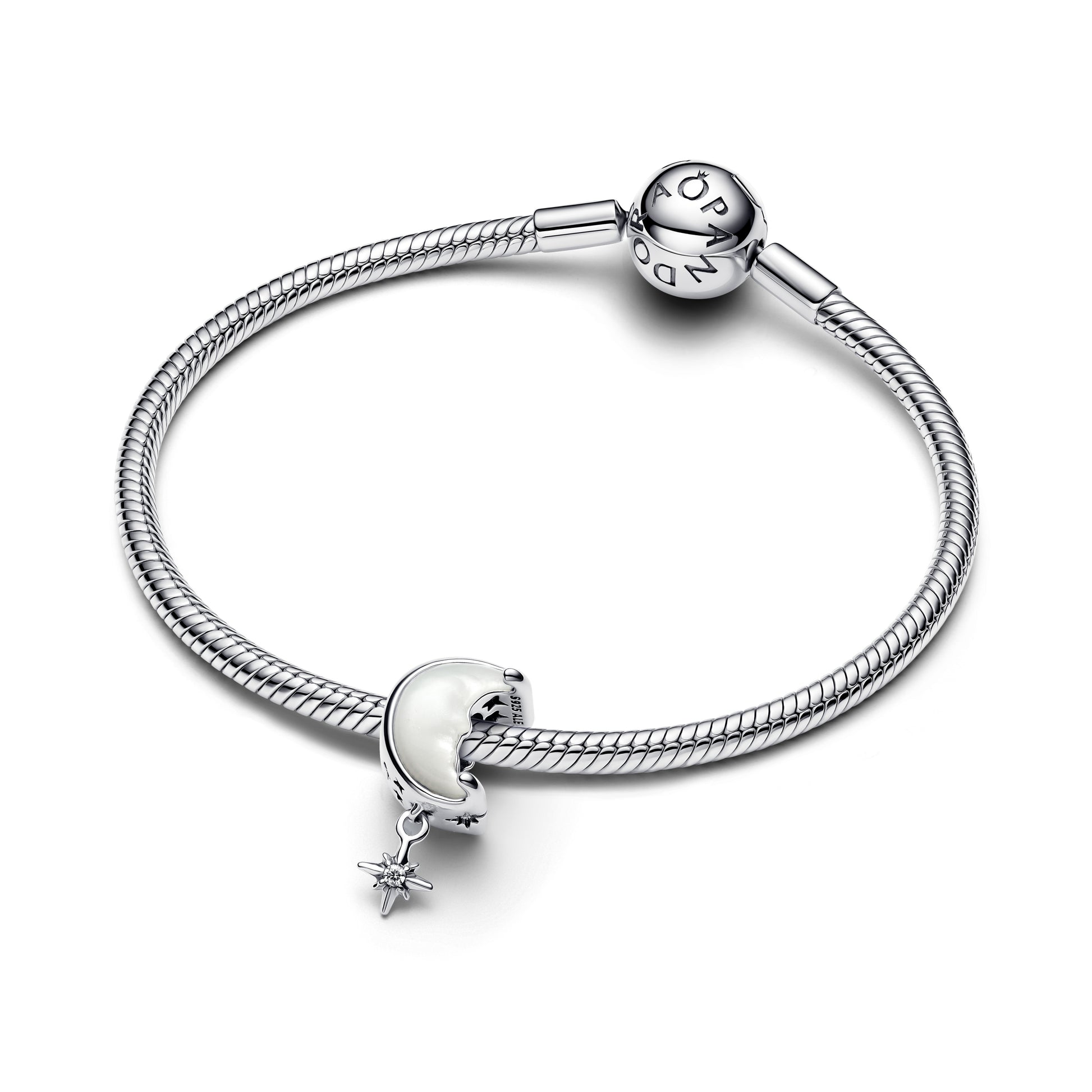 Moon And Star Sterling Silver Charm With White Bioresin Mother Of Pearl And Clear Cubic Zirconia