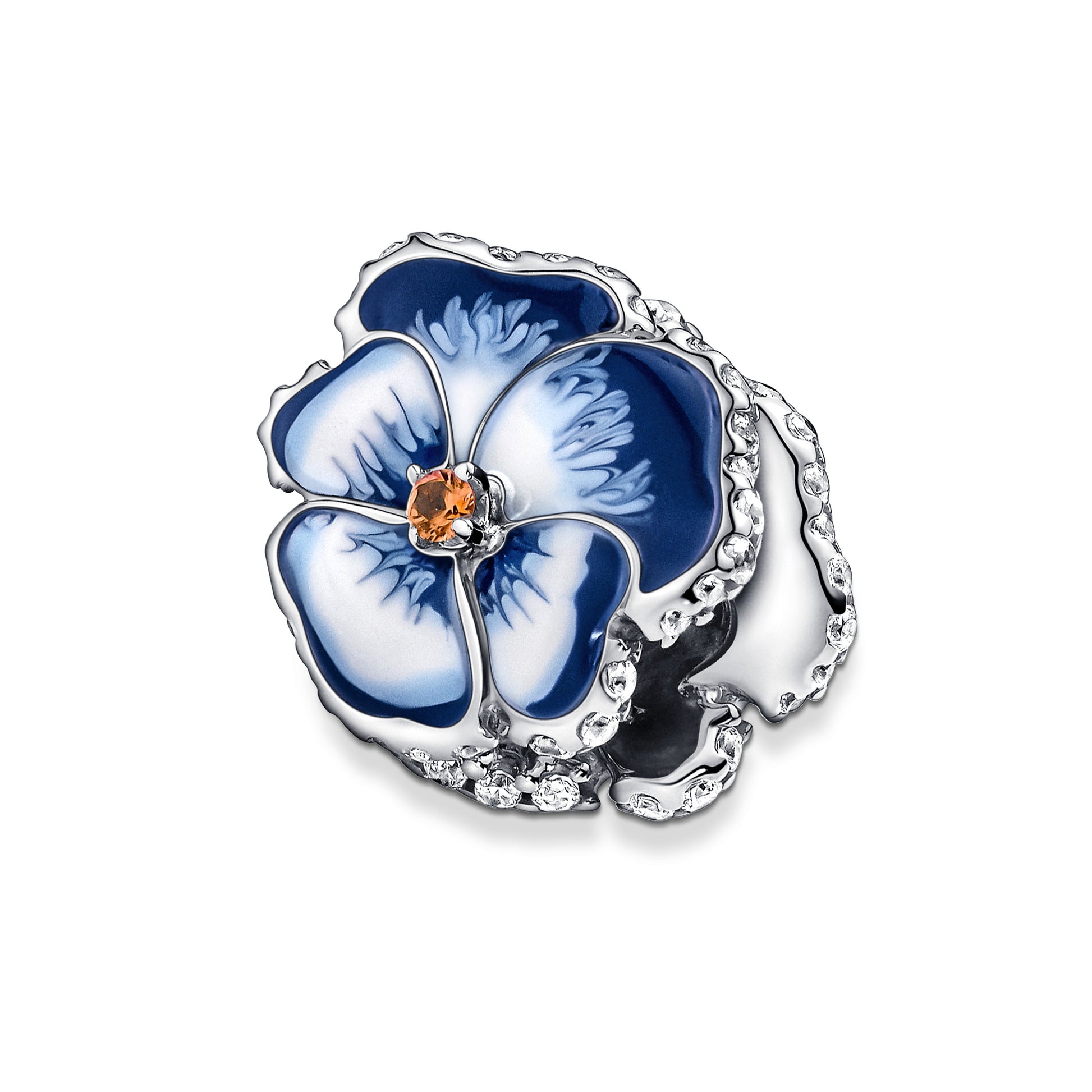 Pansy Sterling Silver Charm With Clear Cubic Zirconia, Burnt Orange Crystal, Shaded Blue And White Enamel