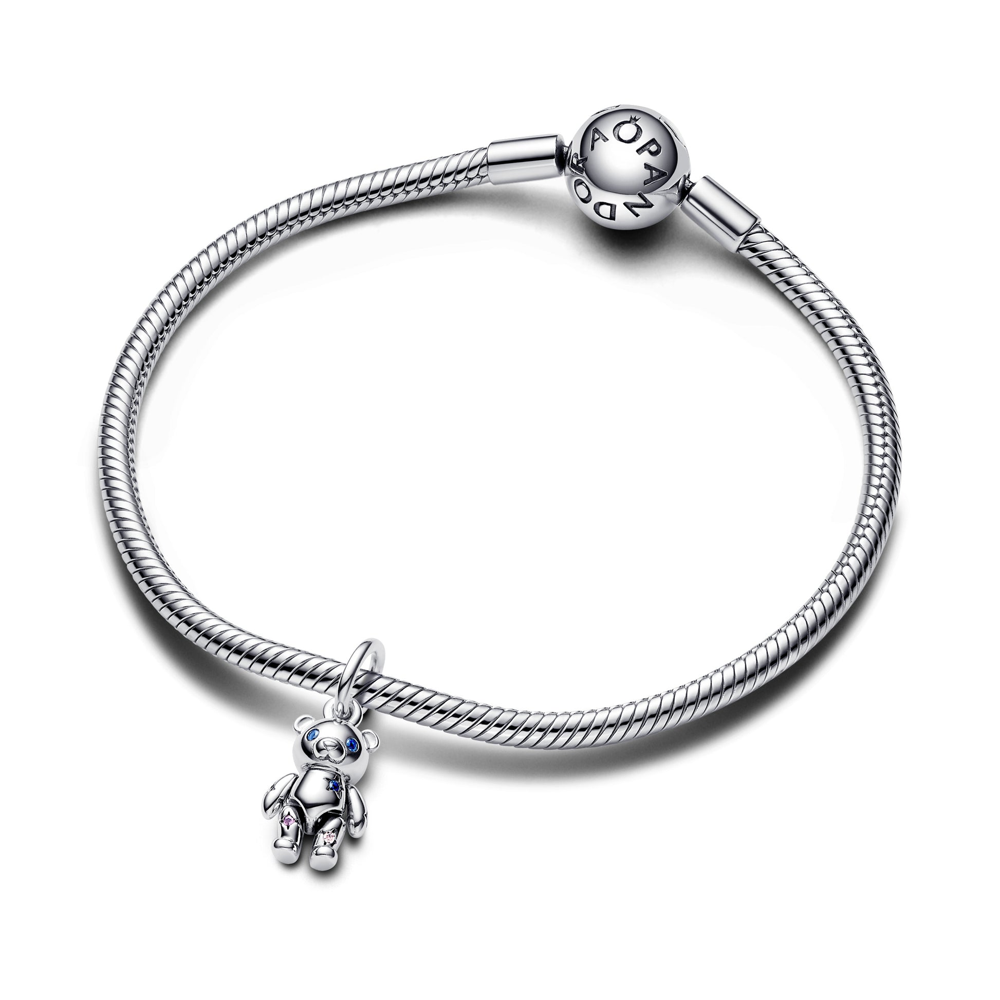 Teddy Bear Sterling Silver Dangle With Fancy Fairy Tale Pink Cubic Zirconia, Royal Purple And Stellar Blue Crystal